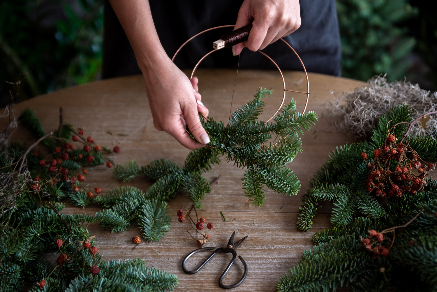 The underlying foliage is often built with greenery like Ivy, Holly, Spruce, and Fir to give a luscious and full base to work with. Foliage Is then often added on top of this with smaller seasonal elements like pinecones, berries, rosehips, and even crab apples.