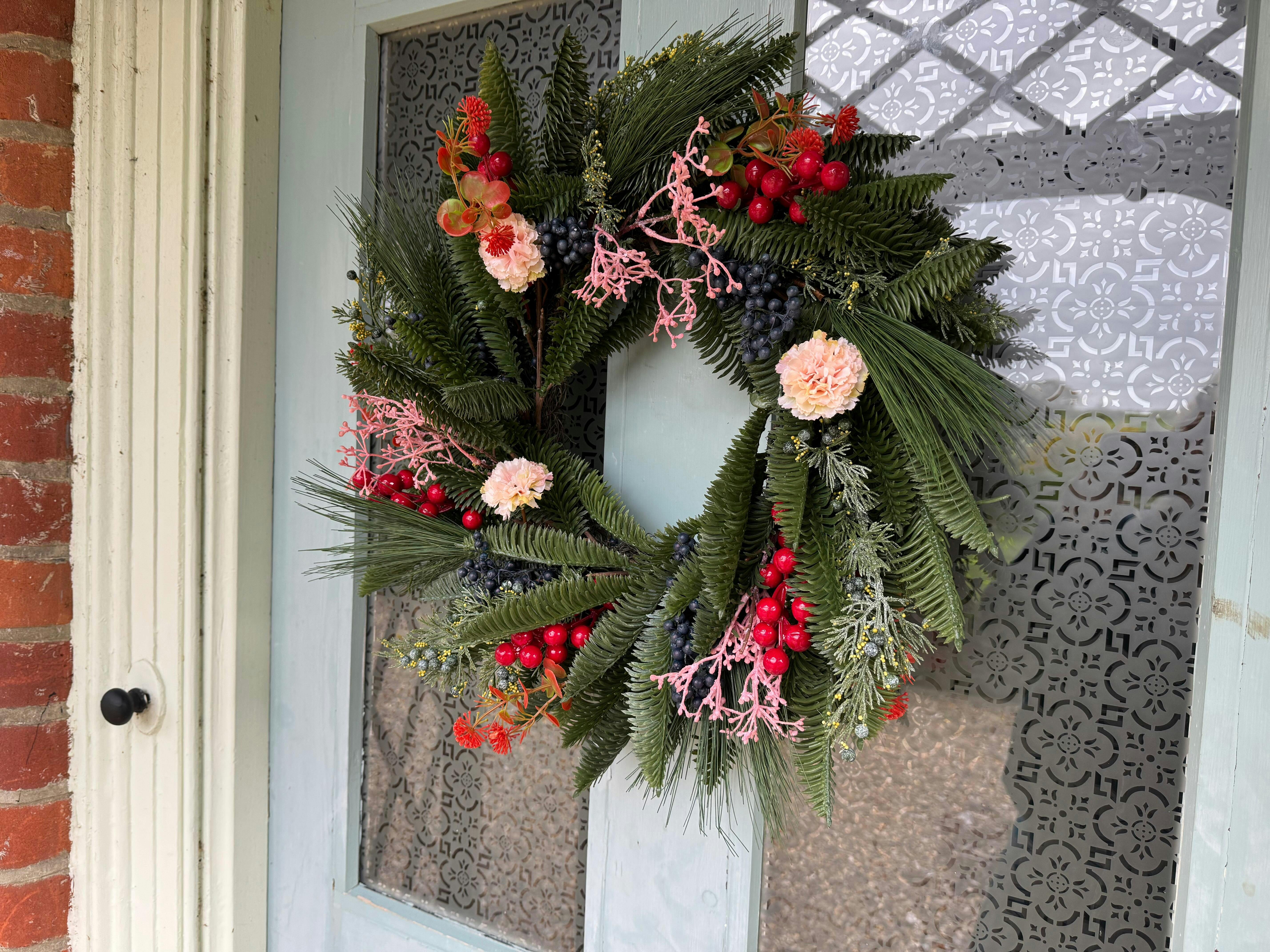 Our luxurious Enchanted Forest wreath features a range of colours including Red, Orange, Pink, Green, Blue.