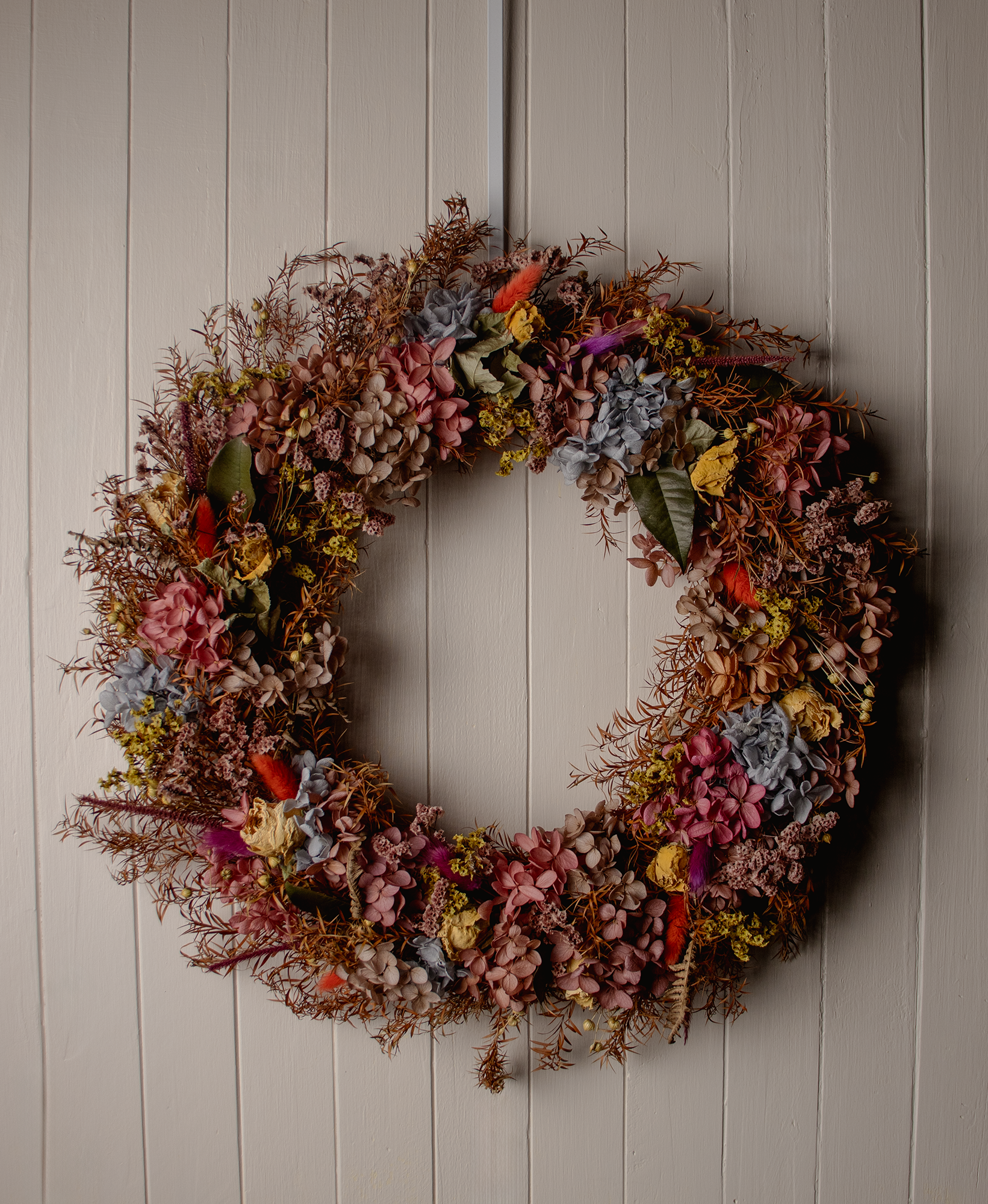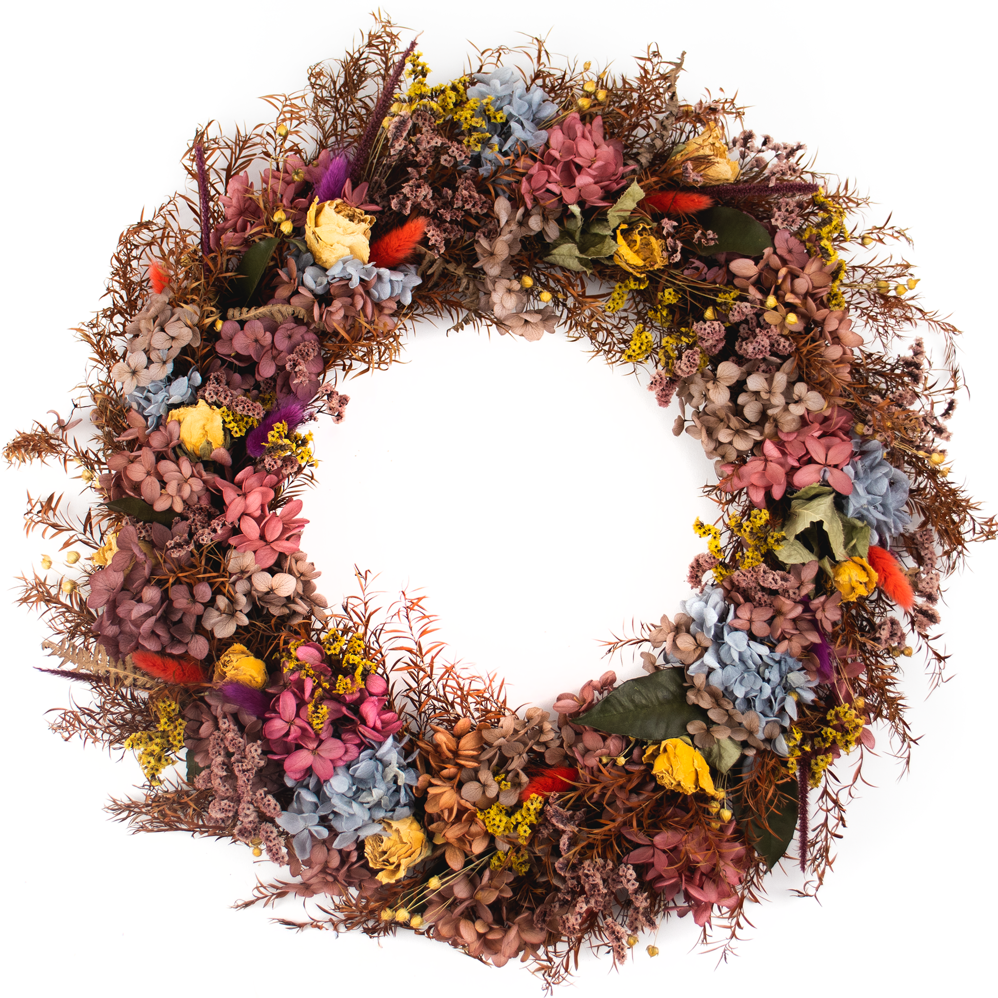 Our luxurious Savanna wreath features a range of colours including Pink, Purple, Blue, Yellow, Dusty Pink, Nude, Orange, Brown.