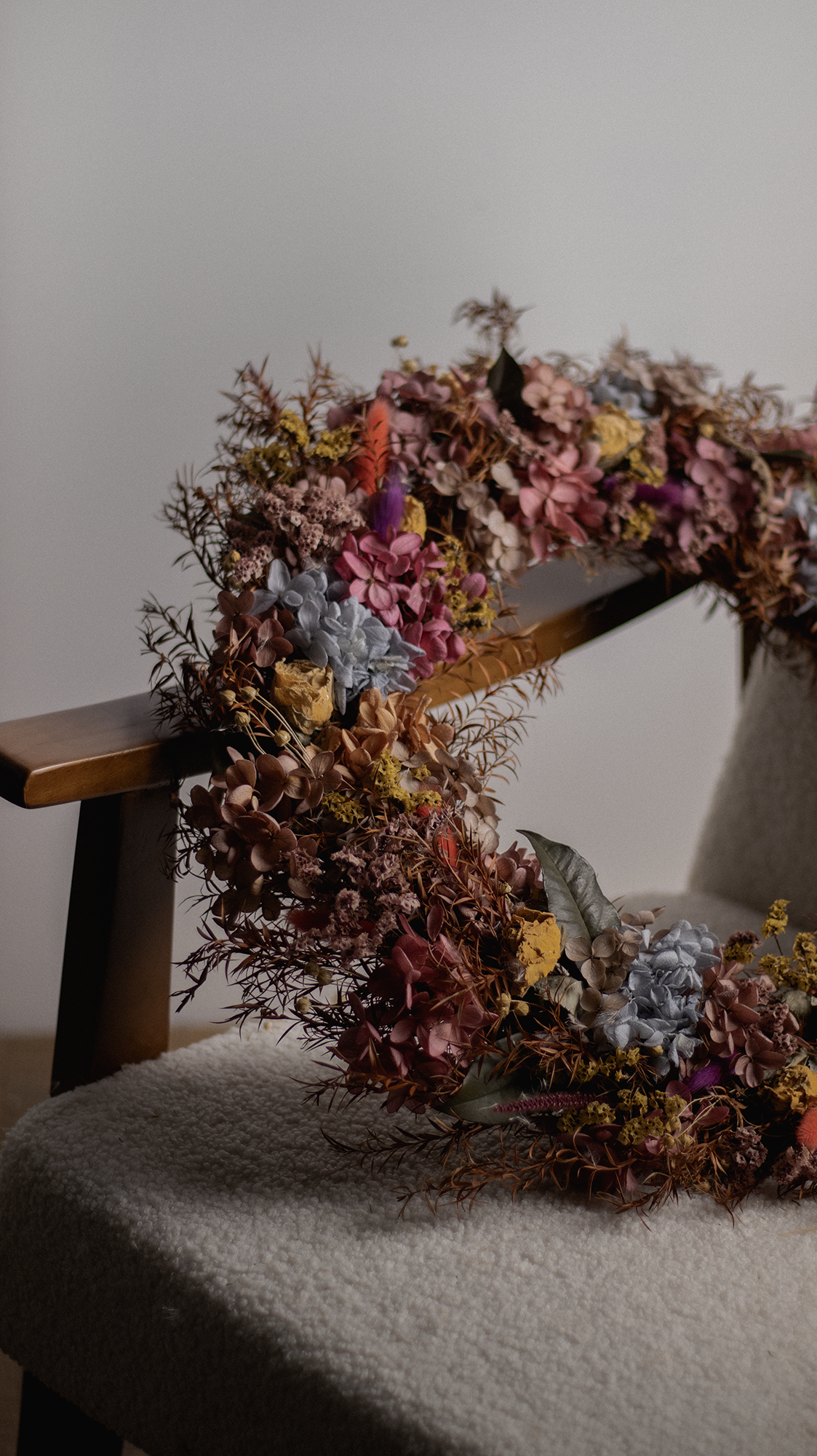 Hydrangea • Roses • Statice • Fern • Achillea • Seed Pods • Dried Grasses • Preserved Foliage