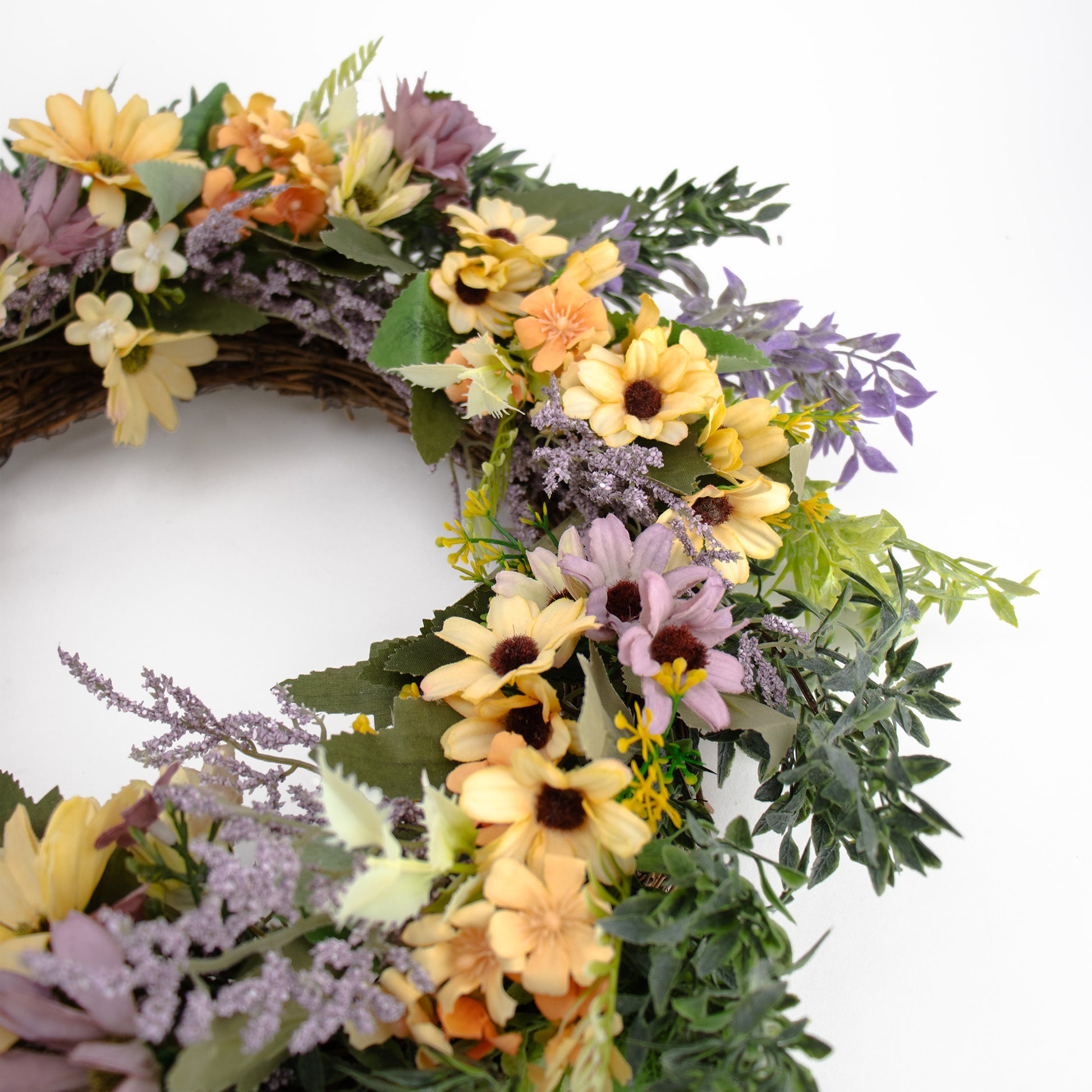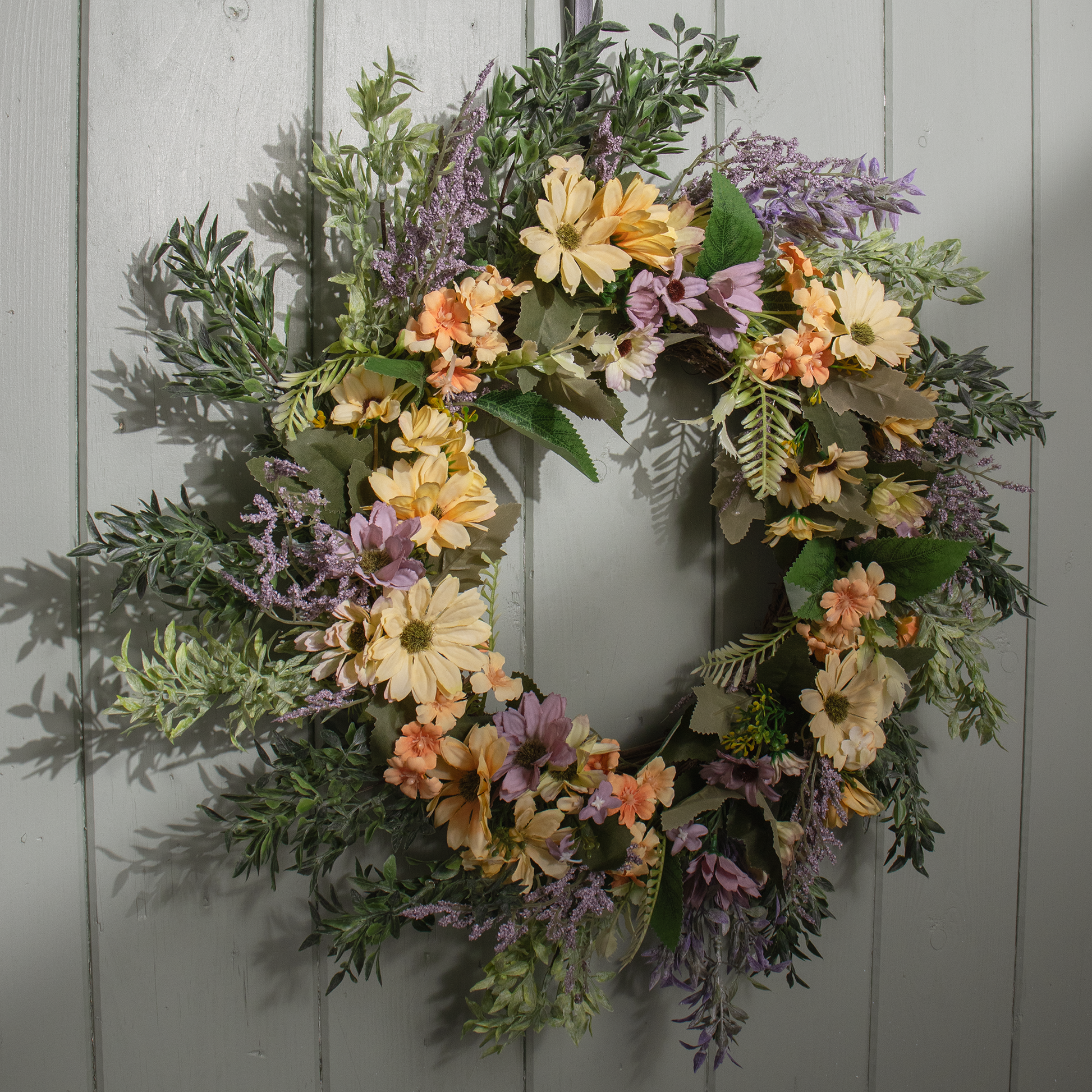 Our luxurious Sanvitalia Spring wreath features a range of colours including Purple, Orange, Yellow, Green.