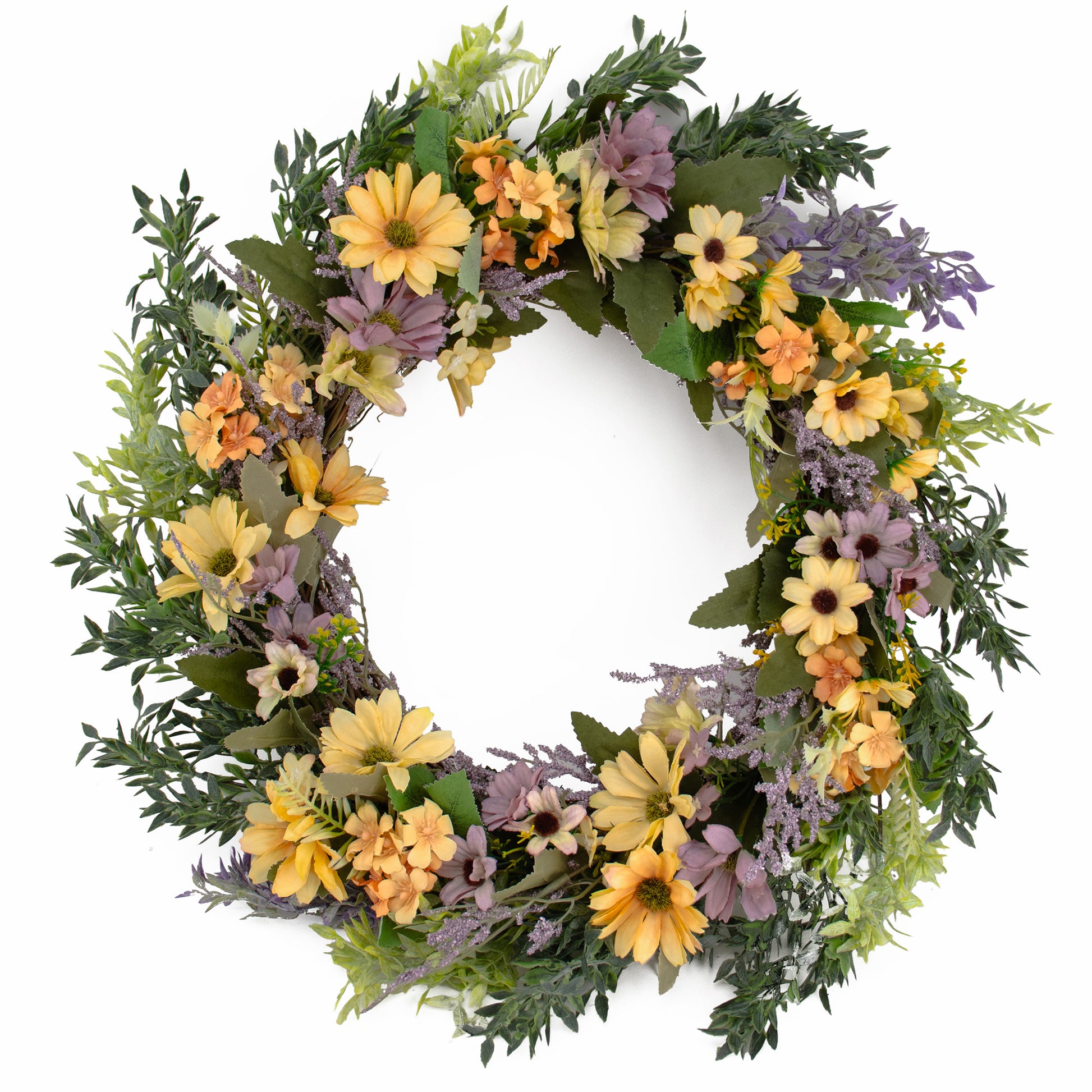 Each flower is crafted to replicate the delicate beauty of its live counterpart, featuring sunny yellow petals that radiate warmth and joy. The blossoms are carefully arranged around a sturdy base, creating a lush and inviting wreath that embodies the spirit of the season.