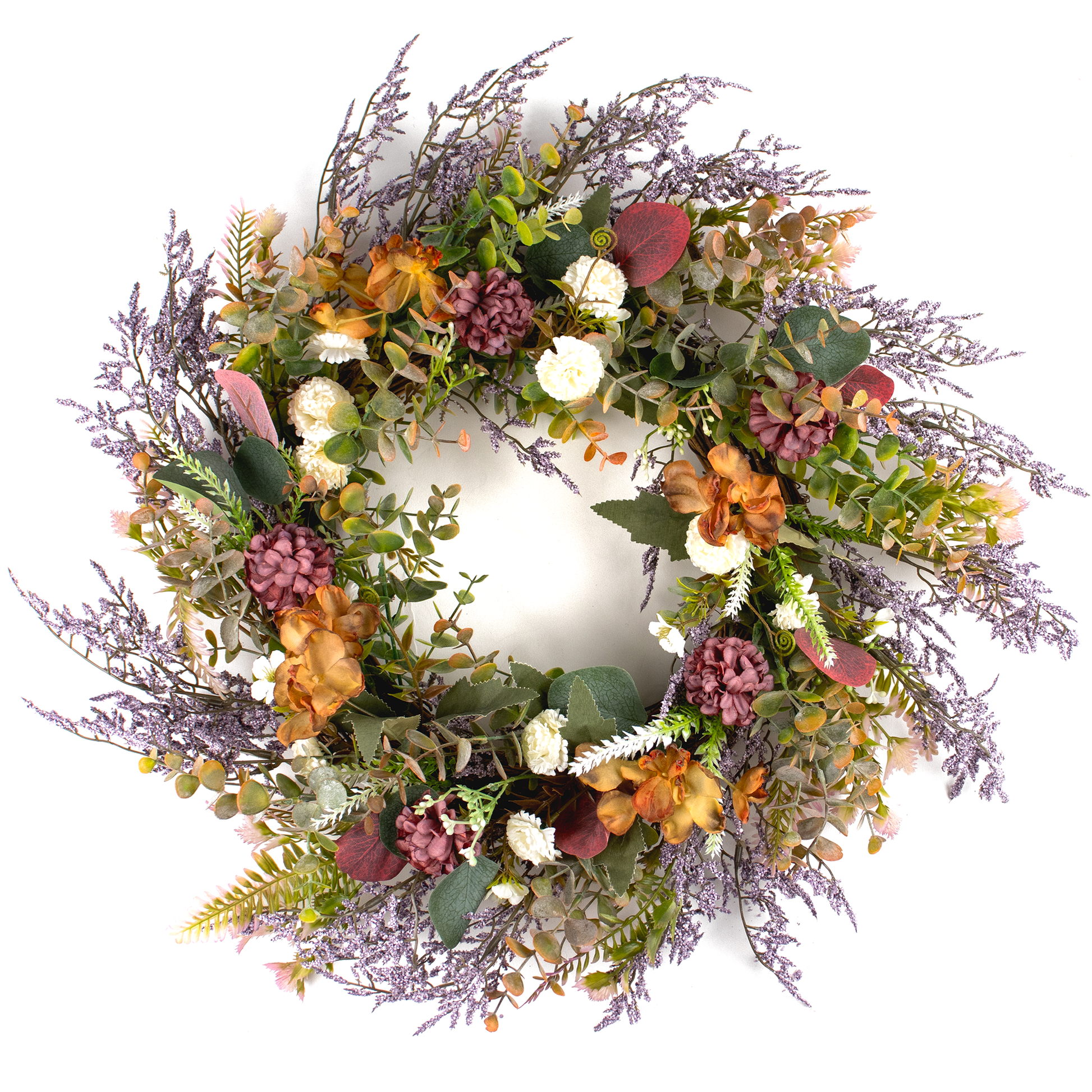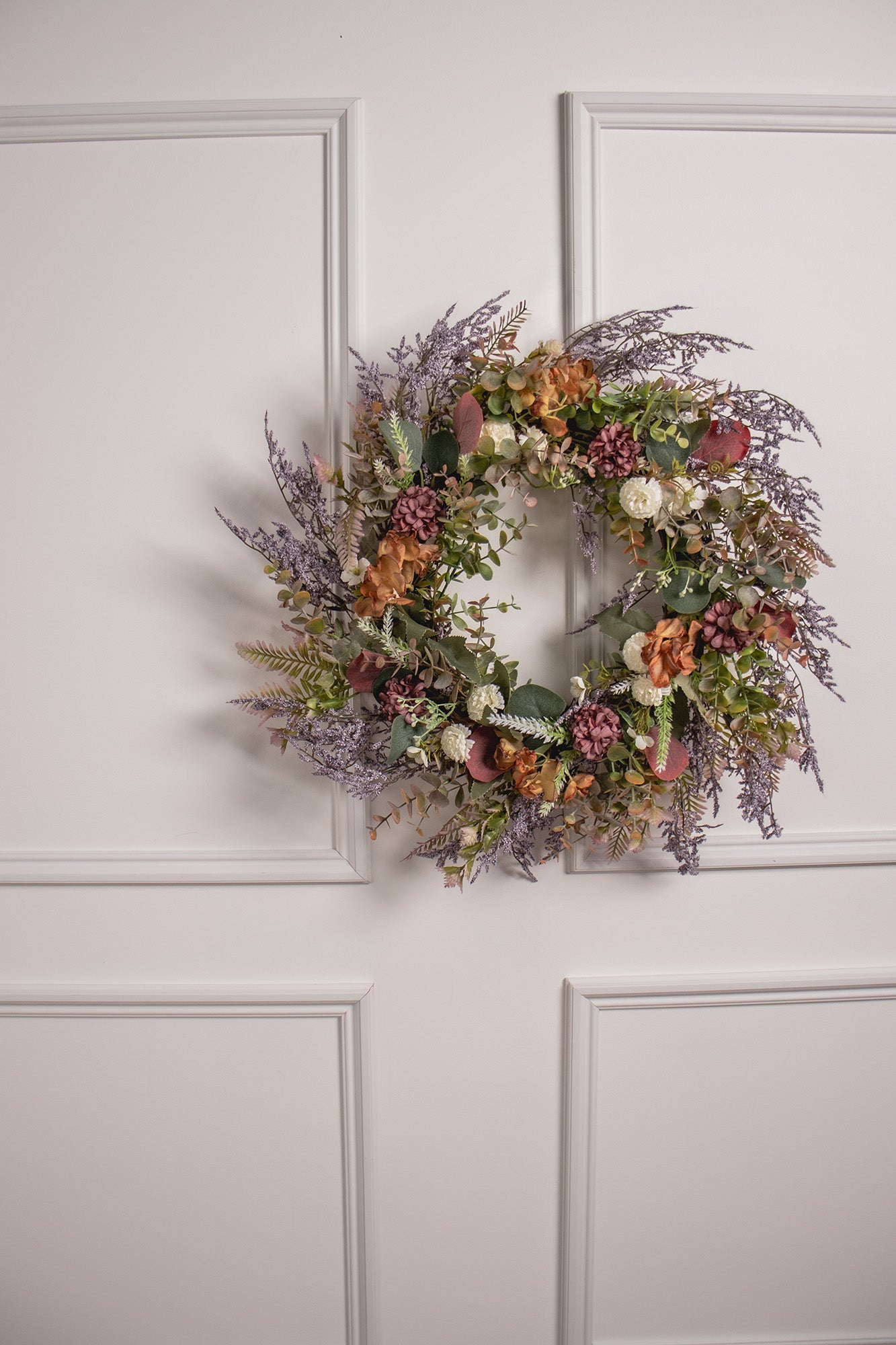 This wreath is a beautiful blend of autumnal hues and natural textures, perfect for fall decor. It features a mix of burnt orange, deep burgundy, and soft lavender flowers, complemented by green foliage and small white blossoms. The addition of delicate ferns and eucalyptus leaves adds a touch of rustic elegance, making it an ideal decoration for welcoming the fall season.
