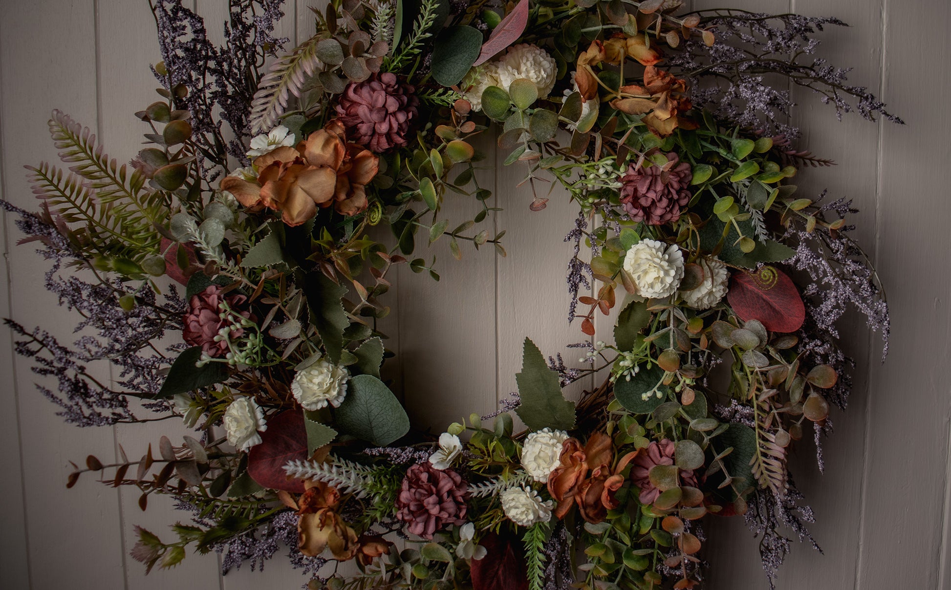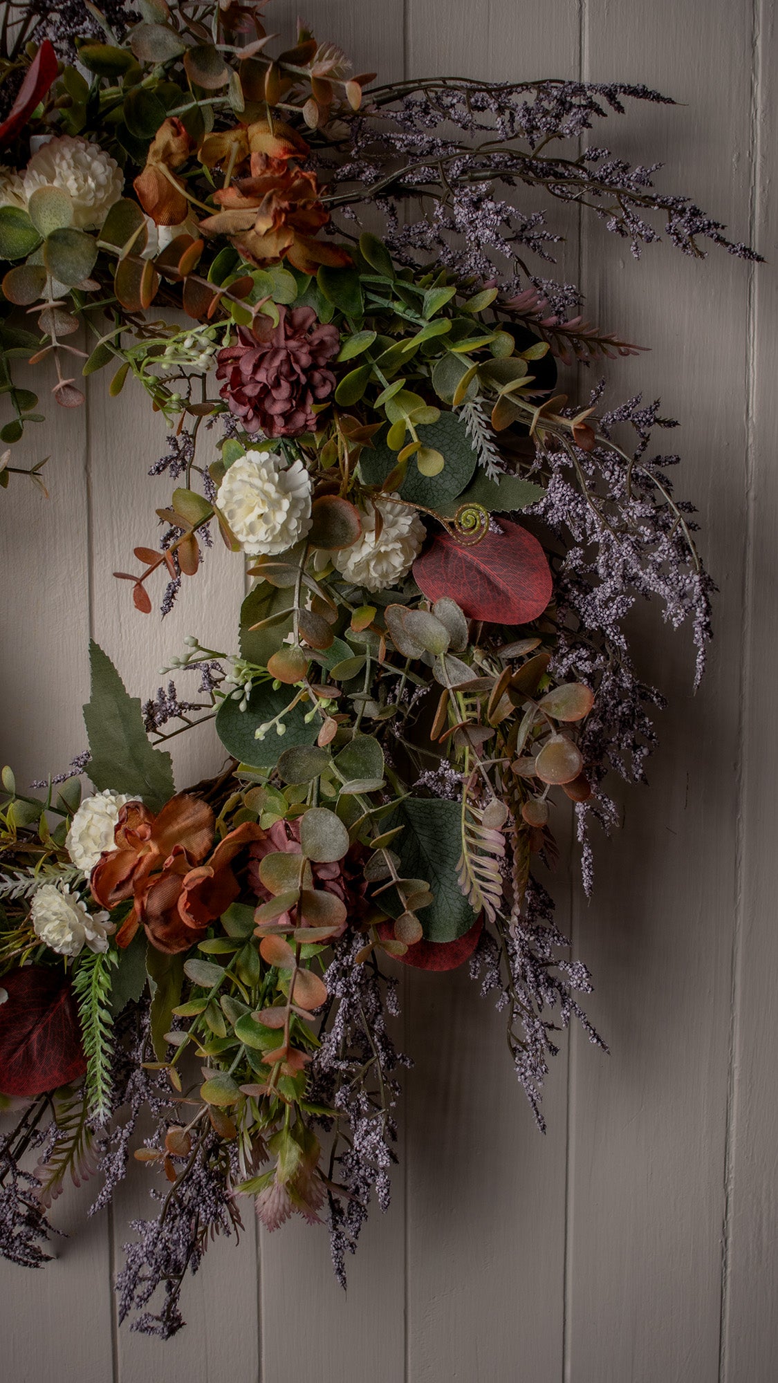 Our luxurious Autumn Breeze wreath features a range of colours including Purple, Orange, Green, Burgundy, White.