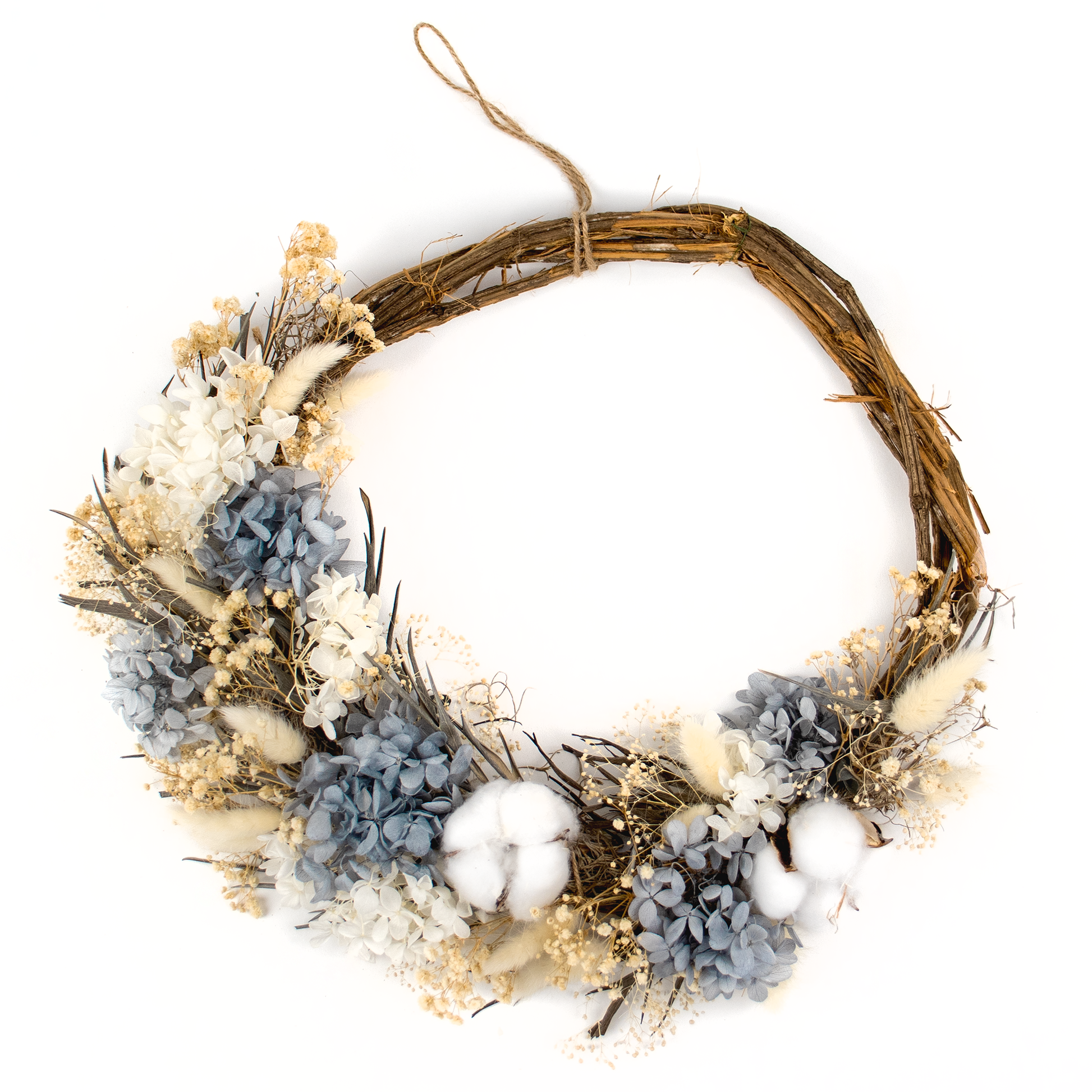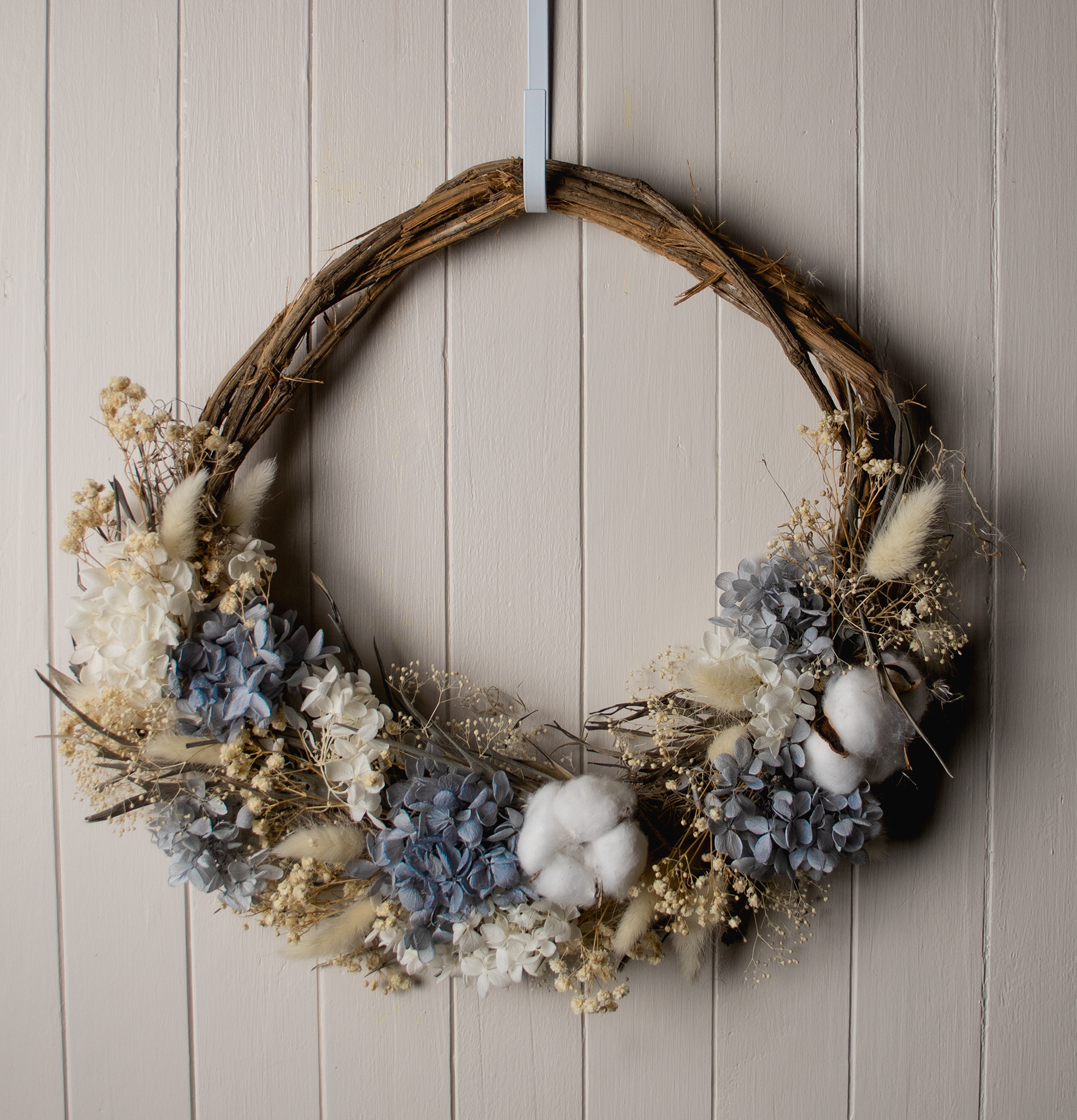 Our luxurious Cotton Blossom wreath features a range of colours including Beige, Ivory, Blue, Brown.