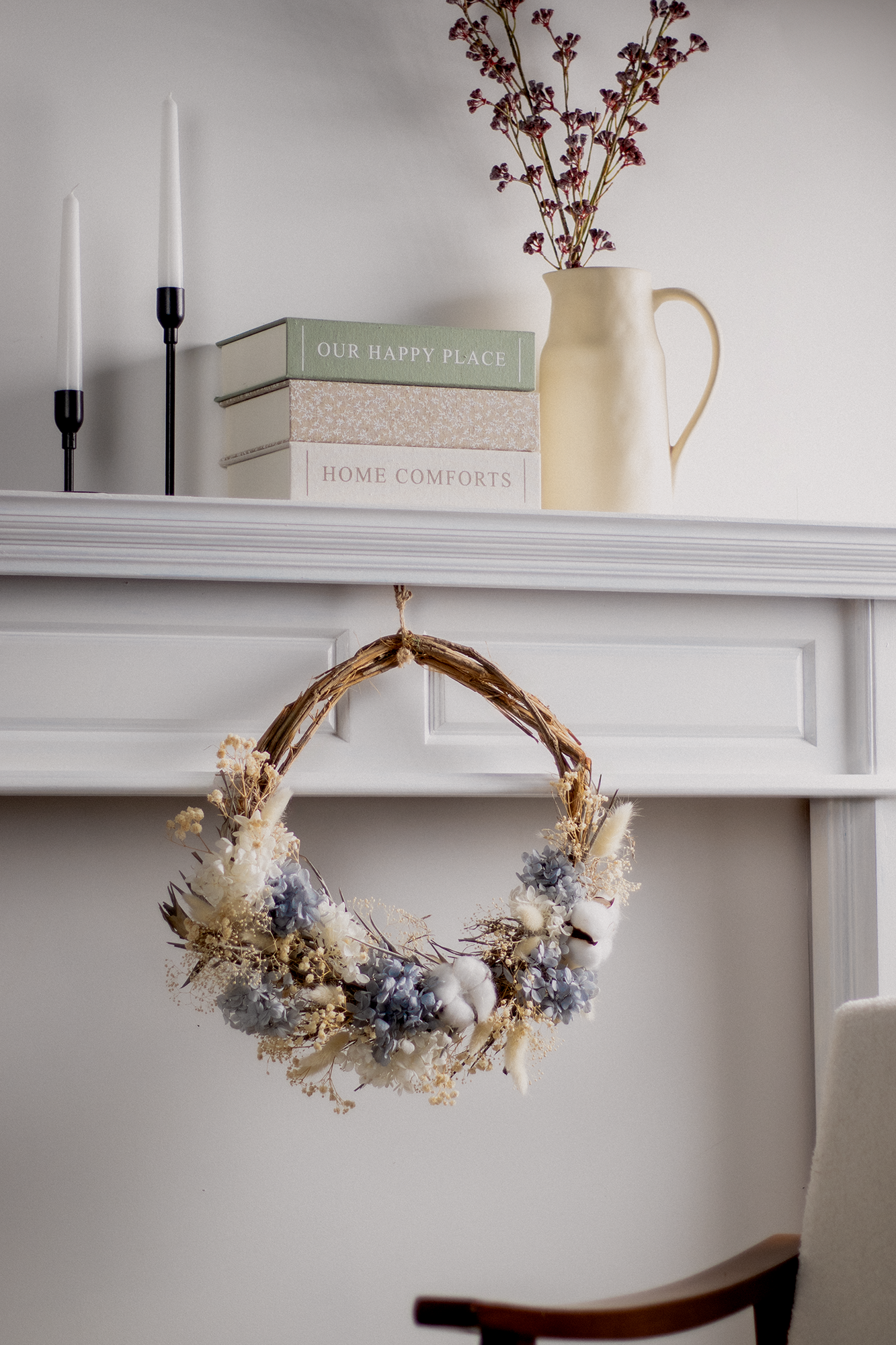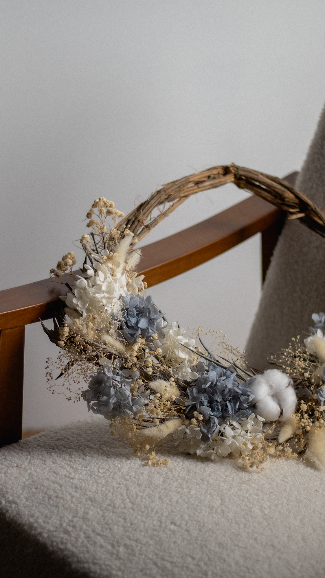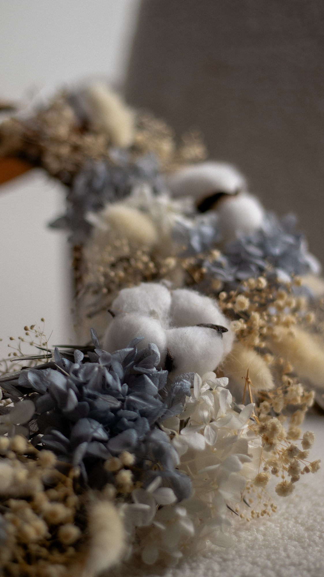 Delicate and dreamy, the 'Cotton Blossom' Wreath adds a touch of natural beauty to any space. Featuring soft cotton bolls nestled among preserved florals and subtle blue hues, this wreath captures the essence of a tranquil winter morning. Its graceful blend of textures and colours creates a timeless piece. Read more