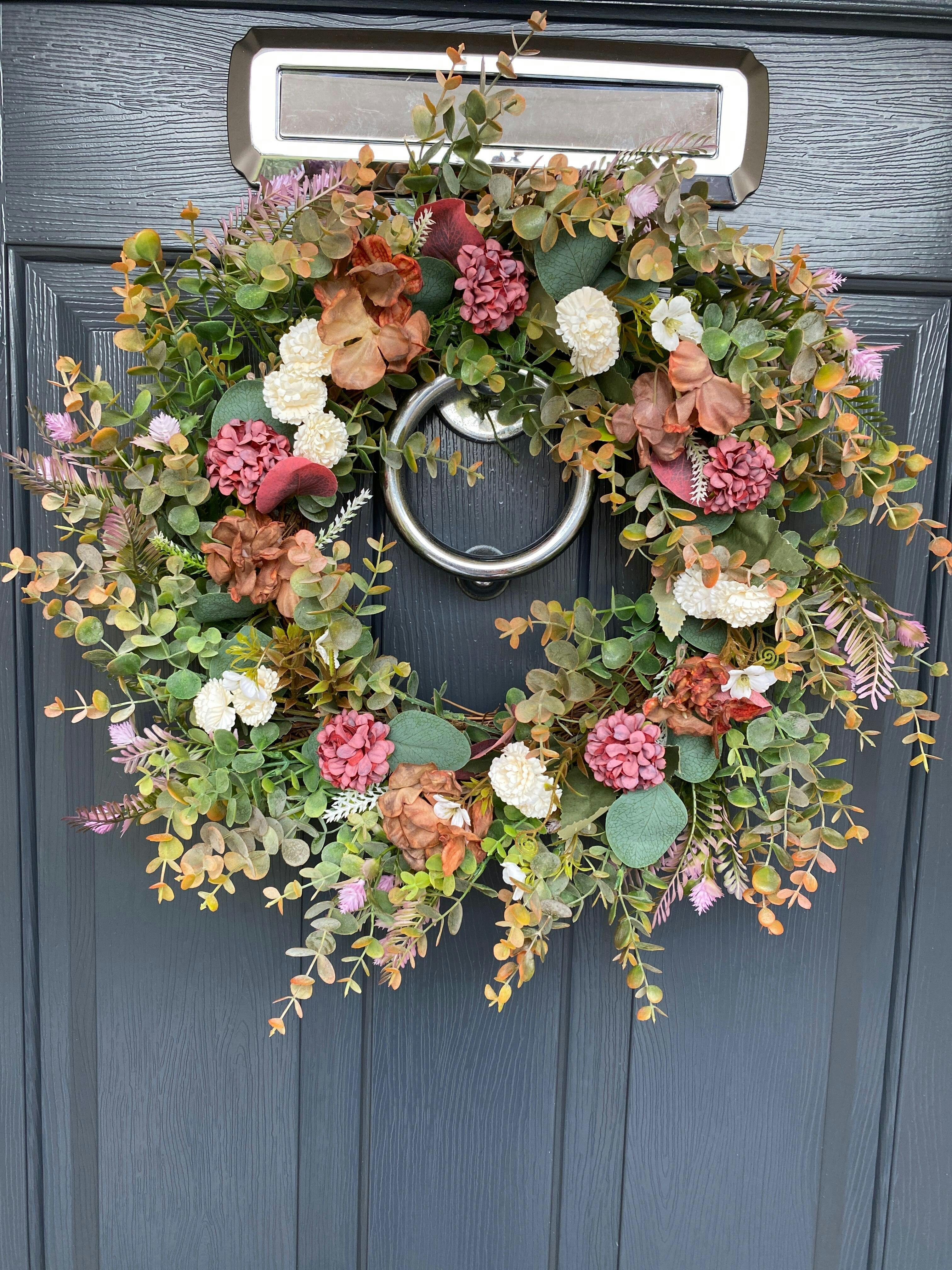 Our luxurious Eucalyptus Fall wreath features a range of colours including Green, Orange, Burgundy, Pink, White.