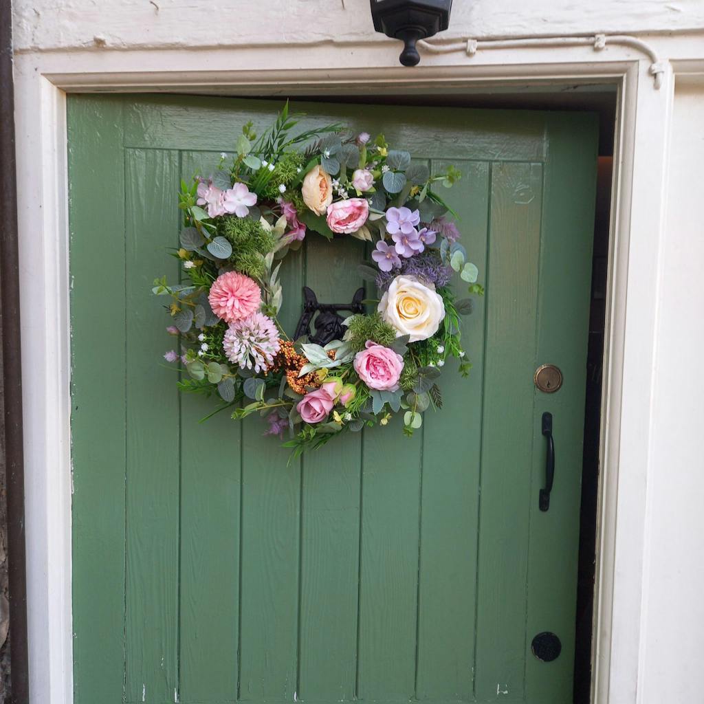 Our luxurious Secret Garden wreath features a range of colours including Pink, Purple, Orange, Peach, Green, Yellow.