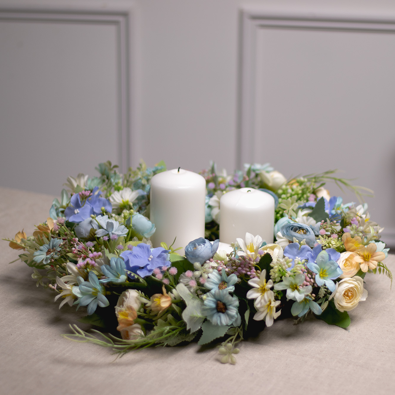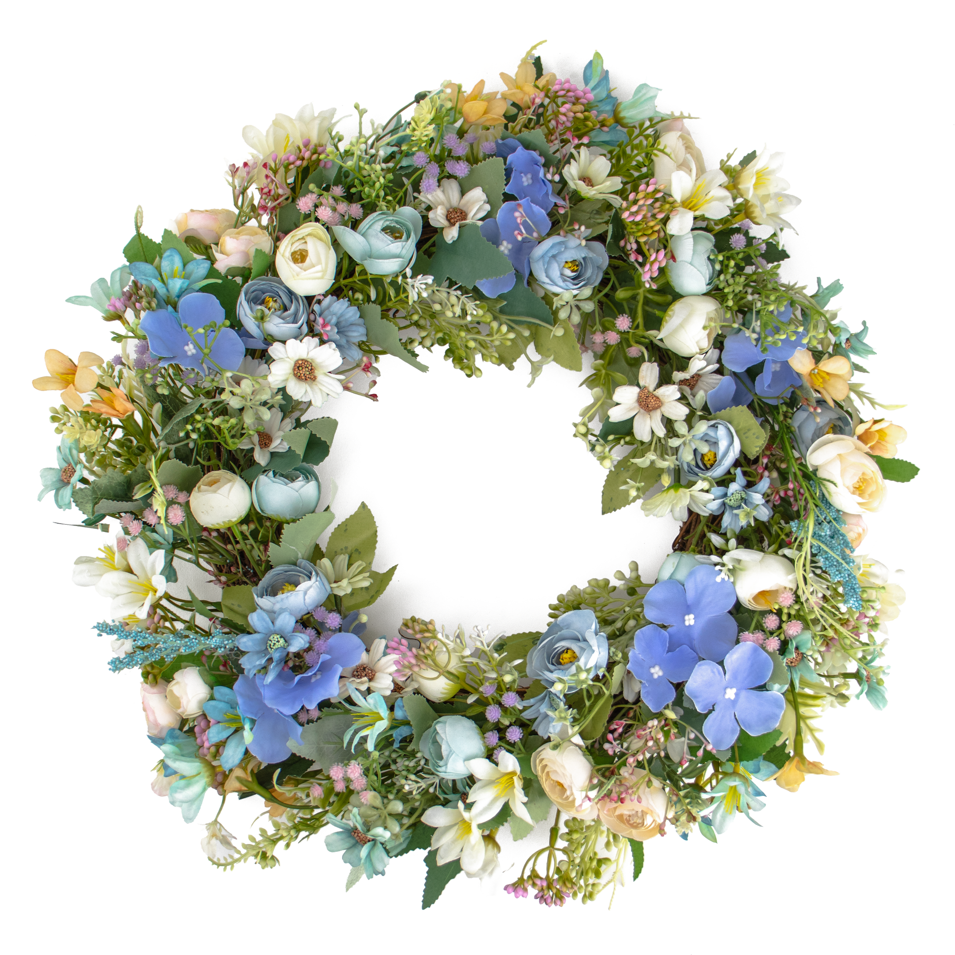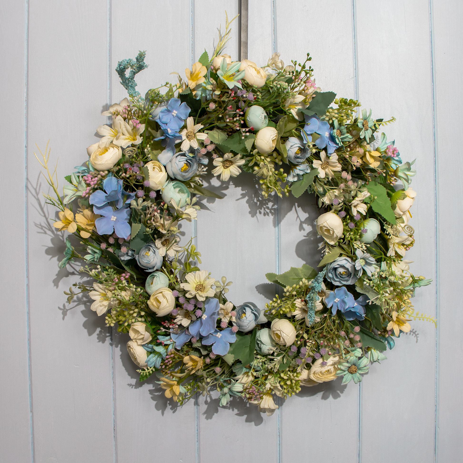 Our luxurious Blue Blossom wreath features a range of colours including Blue, Cyan, Pink, Green, White, Cream, Yellow.
