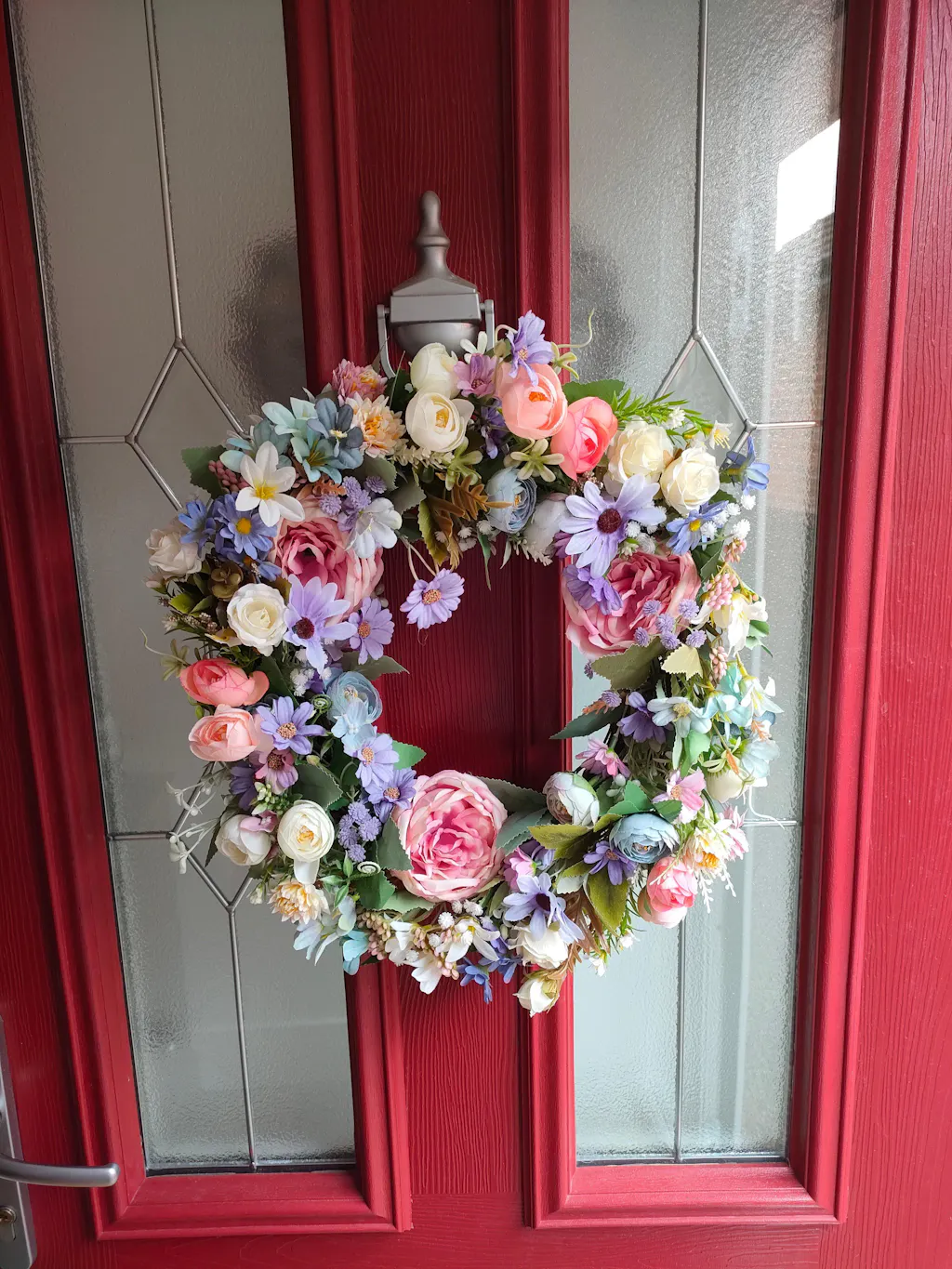 Our luxurious Pink Peonies Wreath wreath features a range of colours including Blue, Pink, Purple, Green, White.