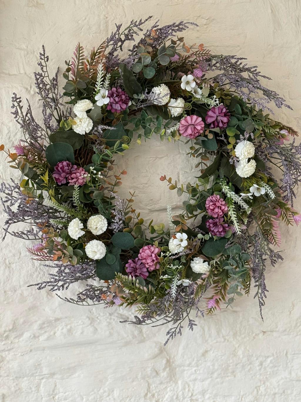 Our luxurious Secret Garden wreath features a range of colours including Pink, Purple, Orange, Peach, Green, Yellow.
