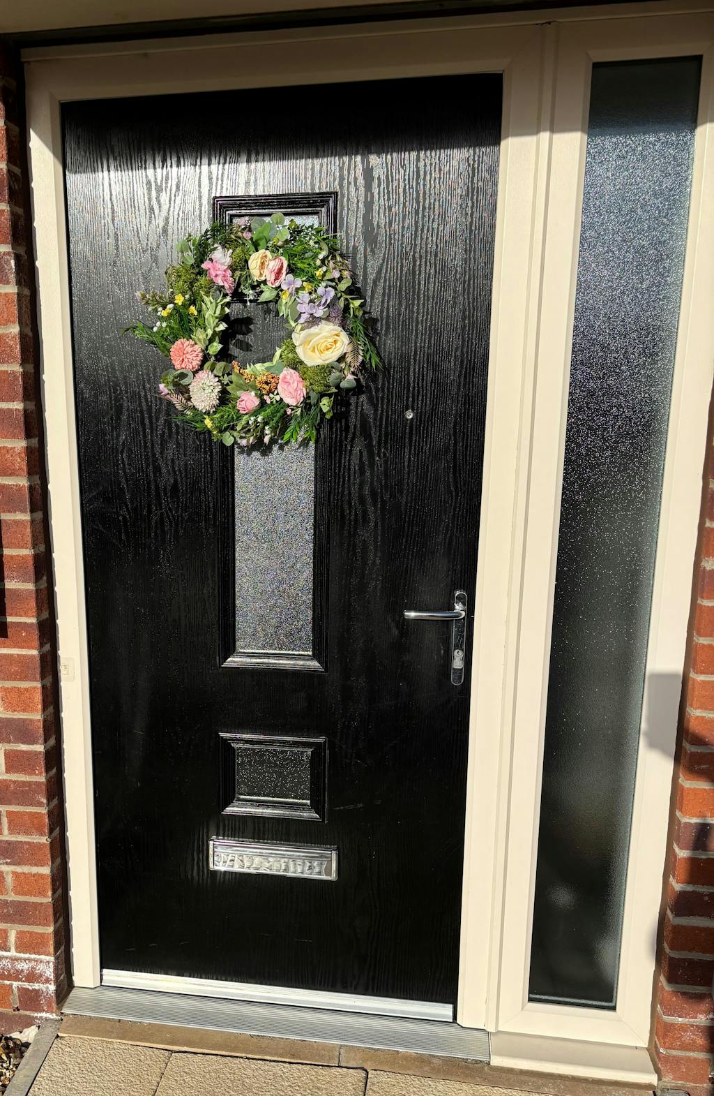 The beautiful flowers on the wreath are perfectly arranged, and truly enhance my door.