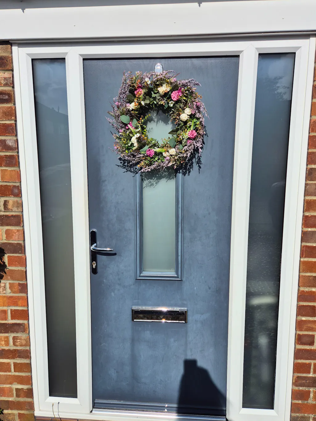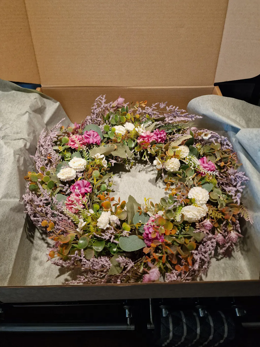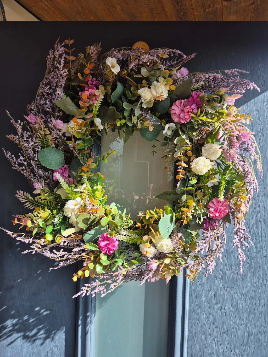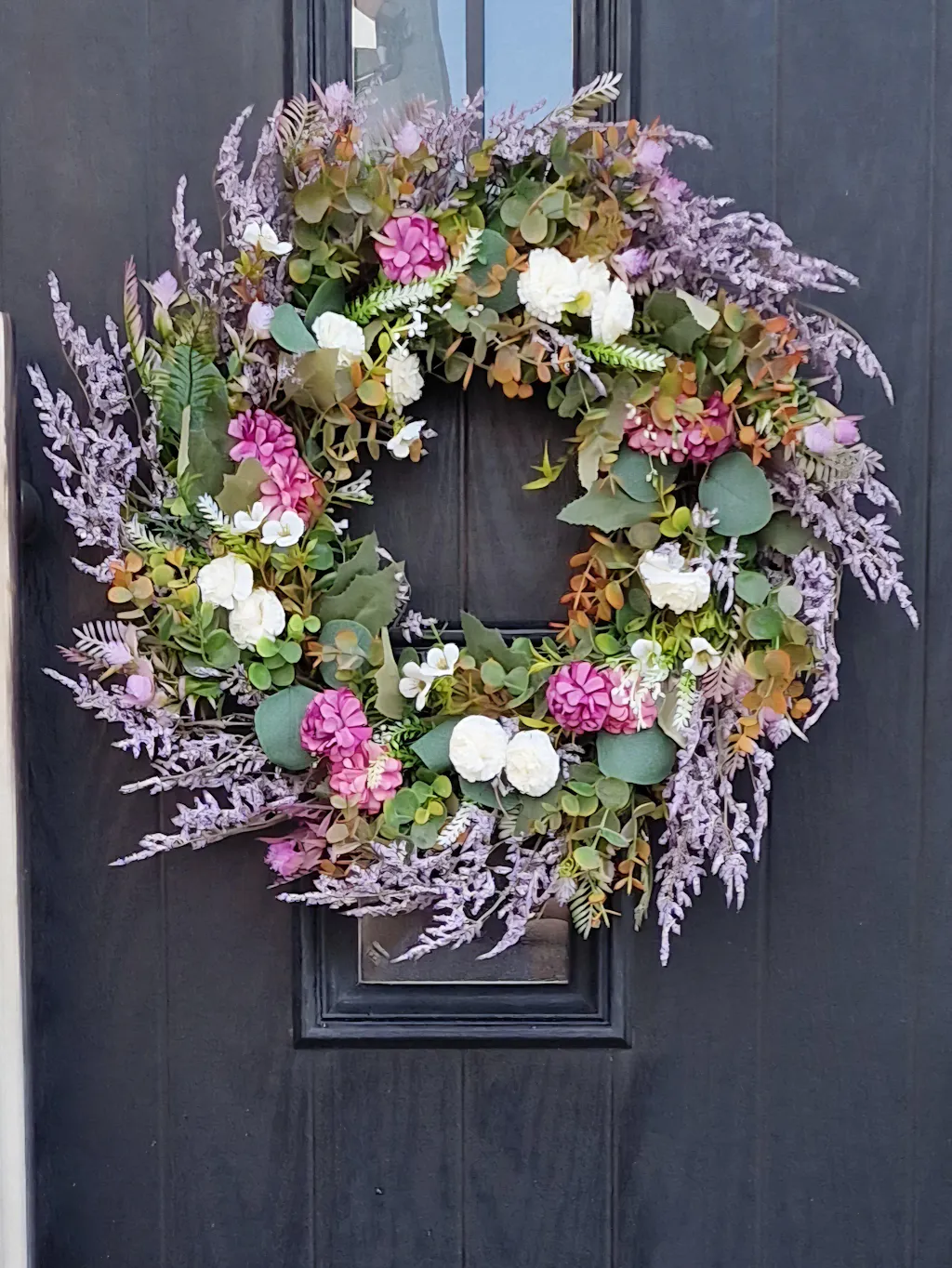 Our luxurious Eucalyptus Breeze wreath features a range of colours including Purple, White, Green.